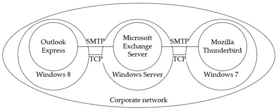 The following is an example of using the model to describe a computer network. A small computer network consists of three computers, one of which has a mail server, and two mail clients. Since we consider only software, computers are represented by operating systems. To provide an example, not all communications between operating systems and software are provided. A graphical representation of the metagraph describing this network is presented in Figure 1.
