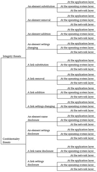 The following is a comparison of the types of threats identified in this paper with those in [], which uses a similar approach to the classification of system elements. In [], four levels of system elements are distinguished: the physical layer, network layer, operating system (OS) layer, and application layer. The physical layer in connection with the limitations established in this paper is not considered in the comparison. The following threats are listed as threats to the software: