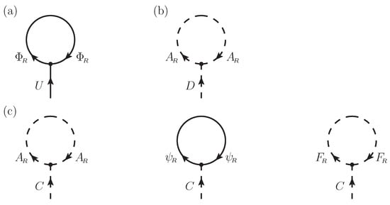 Here, we perform an effective potential analysis based on the Weinberg tadpole method [] with the effective Lagrangian in component form. Vanishing tadpole conditions can be obtained for the scalar potential up to one-loop level. The related tadpole diagrams are shown in Figure 2. If C and D fields can develop nonzero VEVs, the two tadpole equations corresponding to D-tadpole and C-tadpole are, respectively,