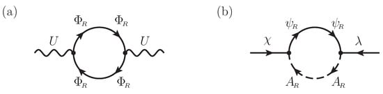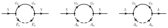 Along with the generation of the real superfield composite, it is important to see if all of its components have sensible kinetic terms. For and , we have chirality-conserving self-energy diagrams as illustrated in Figure 5, which give rise to kinetic terms as with