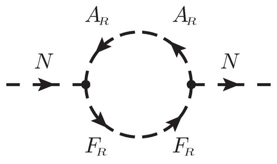 Corresponding to the dynamical generation of soft mass, supersymmetry would be broken. One consistency check is the existence of the massless Goldstino state. Analytically, the required analysis is the “quark-loop” corrected two-point function for the composite superfield U, as shown in Figure 4. The loop contribution is also expected to generate a kinetic term to turn U into a dynamic one. Here, we need only the part for the fermionic components. There are two fermionic components in U—the and , with the tree-level Dirac mass term . Note that the Lagrangian contains a symmetry, with N, and having charges −2, −1, and +1, respectively, whereas carries charge 1. With , the symmetry is maintained, which protects against any generation of or (Majorana) mass term. In the loop correction to two-point function for U, we have one component diagram contributing to the fermion mass matrix as in Figure 4. It gives a mass as