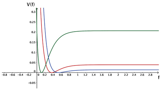 The profile of the scalar potential in Equation (90) for the values (green), (red), and (blue).