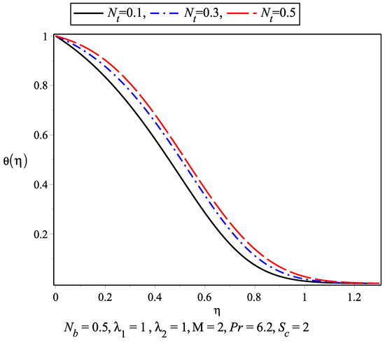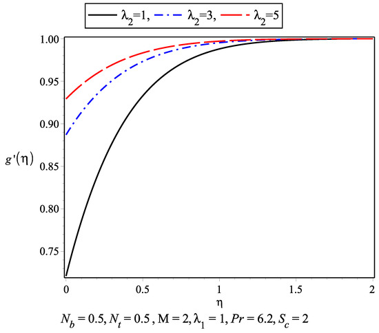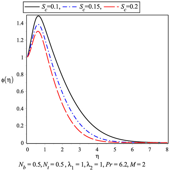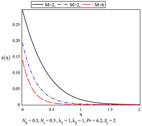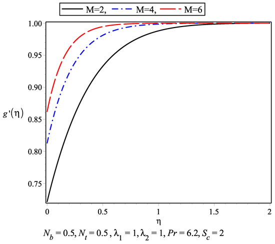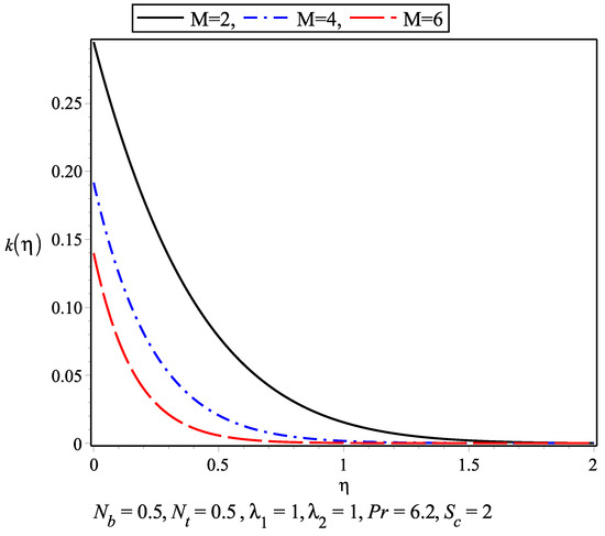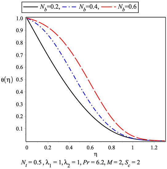 The temperature profile for the nanofluid against different values of thermophoresis parameter and Brownian motion parameter are plotted in Figure 5 and Figure 6. As the temperature increase within the boundary layer, the values of these parameters increase. The thermal boundary layer is achieved earlier than the momentum boundary layer. The variation of nanoconcentration for different values of Schmidt number and is presented in Figure 7 and Figure 8, respectively. It is observed that nanoconcentration decreases as the increase in and boundary layer thickness decreases. Also, with the increase in , the nanoconcentration decreases. Figure 9 and Figure 10 show the velocity profile for different values of magnetic parameter and for . It is observed that in the absence of magnetic parameter M, the boundary layer thickness is larger than while M is present. in Figure 11 and Figure 12 represents the results of Wang [5]. The slip parameter ratio can be defined as . Figure 13 and Figure 14 describe the for . The range of varies from 0.2 to 10. represents the isotropic case where and .