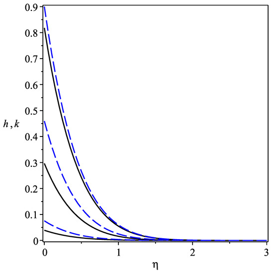 Figure 1 and Figure 2 show the variation of velocity profile and against for different values of magnetic field M and slip parameter . It was observed that increasing in the values of M and causes increase in the velocity profile, while boundary layer thickness reduces. Thus, these parameters cause a reduction in the momentum boundary layer. Analysis shows that increasing the values of these parameters to a sufficiently large level shows the monotonic behavior of velocity throughout the whole domain. Figure 3 and Figure 4 shows the opposite behavior of h and k with the increment of M and , such that with the increase in value of these parameters, h and k decreases.