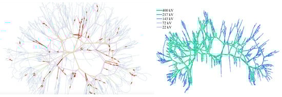 On the left: The red arrows in this network diagram indicate where overloading of power lines could occur in the case2382wp power system, due to short-term fluctuations in (notionally) renewable generator outputs. On the right: The diagram shows the nesta case2224 edin test power system, see [1,2].
