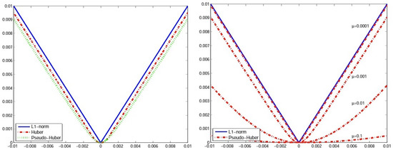 In the next section with the main results, we will apply a second order optimization method, i.e., we will use derivatives of first and second order. However, the -norm is not differentiable. Many researchers in the literature use first order optimization methods and apply appropriate smoothing to the problem by using the Huber function. In our case, this is not possible since the Huber function is differentiable, but not twice differentiable. Hence, we propose to replace the -norm with the pseudo-Huber function [15,16], see Figure 2. The pseudo-Huber function parametrized with is: