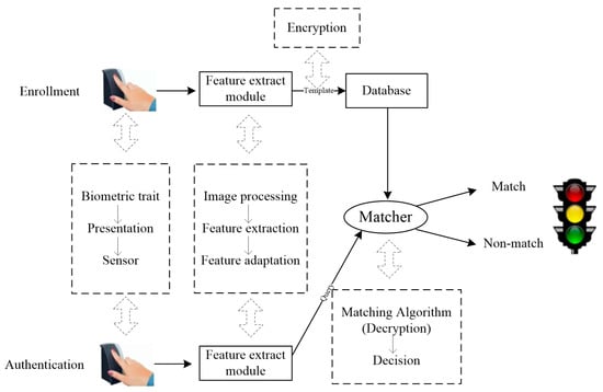 Generally, a typical biometric system comprises four modules, namely, sensor module, feature extraction module, template database, and matching module. Specifically, the sensor module acquires the biometric image. A set of global or local features are extracted from the acquired biometric image by the feature extraction module. Structured feature representations are stored in the template database as template data. The matching module is responsible for comparing the query and template data to reach a match or non-match verdict. A typical biometric system carries out authentication in two stages [3,4]—the enrollment stage and verification stage—as shown in Figure 1. Take fingerprint recognition as an example. In the stage of enrollment, a user presents their finger to the fingerprint sensor and a fingerprint image is acquired by the sensor module. Certain features of the acquired fingerprint image are extracted, and further adapted or transformed to generate template data for the purpose of comparison in the verification stage. In the verification stage, the fingerprint image of a query is collected by the sensor module. The feature representations of the query fingerprint image go through the same process as in the enrollment stage, so as to obtain query data. The query data are then compared with the template data so that a matching outcome is attained.