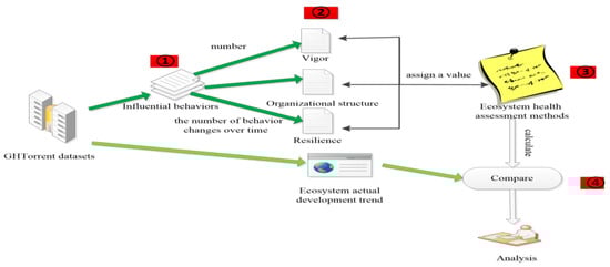 Definition 1. The health of the GitHub ecosystem generally refers to the behavior of those participants (developers, users, etc.) and the resulting behavior that always results in a trend that is consistent with the project’s survival and development, providing continuous service in the event of disruption, and also meeting people’s needs for project capabilities.