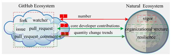 Definition 2. The indicators of ecosystem health in the GitHub ecosystem include vigor, organizational structure, and resilience. Vigor is the primary productivity, represented by the number of user behaviors in the project. The organizational structure of ecosystem health is represented by the contribution of different behaviors of the developers. Resilience is the ability of ecosystem to maintain its structure. It is the ability of the system to overcome pressure when it is disturbed (such as the developer’s departure), and mainly focuses on the recovery rate after interference. Figure 3 is the mapping of health indicators of the GitHub ecosystem and natural ecosystem. 3.3. HPGE