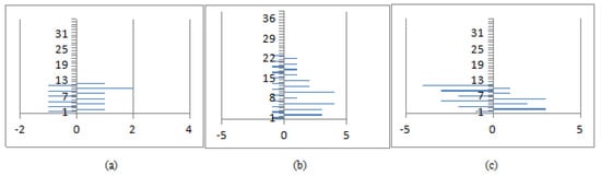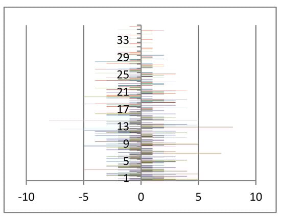 The horizontal axis represents the number of consecutive months of pull_request increasing or decreasing, while the vertical axis represents the month of project from publishing to interception. 0 indicates the number of pull_request (elements) at the beginning of the project, and the negative number indicates the number of months falling. For example, −2 indicate that the number has decreased continuously for 2 months, and 2 indicates that the number has increased continuously for 2 months. As we can see from