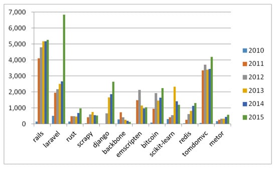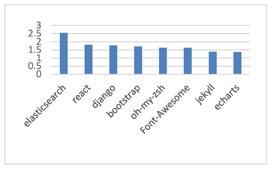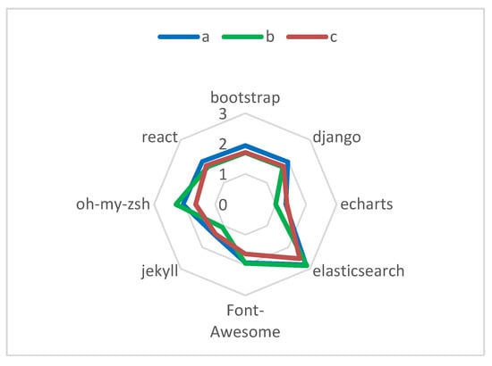 Figure 10a and b, the health orders are the same, that is, elasticsearch > oh-my-zsh > reach > django > bootstrap > Font-Awesome > jekyll > echarts.