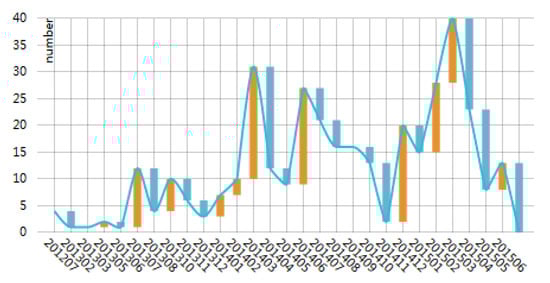 Figure 7, we can see that, from the project creation to June 2015, the number of increasing months is 25, the number of decreasing months is 23, and the overall trend of projects is on the rise.