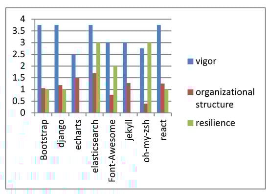 According to Formula (1), we know that the health of ecosystem system is composed of vigor, organizational structure, and resilience. After many experiments have been conducted, we made the following conclusions: (1) we tried to classify the level into three levels, four levels, and five levels, and we found the results had little differences, so we chose the minimum number to classify the levels. The values of 1, 0.75, and 0.5 were used to calculate the vigor in Formula (1), and we performed a large number of experiments and found the values of 1, 0.75, and 0.5 could better show the results. (2) The organizational structure is measured by the contribution of developers, and we chose the top three factors to calculate it. (3) The resilience in one ecosystem can be classified as the resilience is good, or the resilience stays in the same average as before, or the resilience cannot recover to the situation as before. Hence, we divided the experiment results into three levels. For easy calculation in Formula (1), we set resilience good as 1, and the resilience stays in the same average as 0, and the third as −1, and we also use numbers (such as 1, 2, and 3) for calculation.