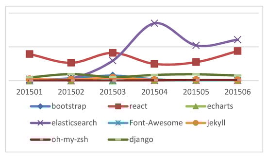 Figure 11, project elasticsearch shows the best health result in eight projects in June 2015, and the next is react, followed by django, bootstrap. Due to the smaller changes in the jekyll and echarts, both are not fully presented in the actual health change charts. Compared with the health prediction method proposed in