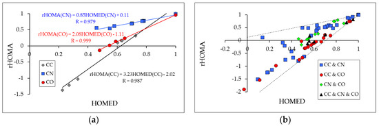 All discrepancies between the rHOMA and HOMED parametrizations discussed above affect the rHOMA vs. HOMED relations for simple π-electron compounds containing heteroatoms. They cannot be ignored even for long series, because the relation between the two parameters strongly depends not only on the type of atoms present in heterocompounds but also on their number. The rHOMA and HOMED indices are almost parallel for compounds containing only one type of bond, e.g., only CC, only CX, or only XY. Figure 2a shows linear tendencies between the rHOMA and HOMED indices estimated for three series of cyclic and acyclic π-electron compounds considered in our previous article [21] such as hydrocarbons containing only CC bonds, heterocompounds containing only CN bonds, and derivatives containing only CO bonds. The slopes of regression lines are different for each series because the normalization α constants for CC, CN and CO bonds are not the same in the rHOMA and HOMED procedures (Table 2). Generally, the slopes of regression lines are close to 1, 2 and 3 for the series ‘CN’, ‘CO’ and ‘CC’, similar to the α(rHOMA)/α(HOMED) ratio for the CN, CO and CC bonds. Some deviations of points from the linear relationships in Figure 2a are a consequence of slightly different values for Ro in rHOMA and HOMED.