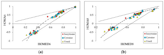Pyrimidine bases (uracil, cytosine, and isocytosine) possess the same number of CC and CN bonds in the pyrimidine ring and two different groups (–NH2/=NH and/or –OH/=O) at 2- and 4-positions. They contain two labile protons that can be moved between five conjugated sites according to different types of prototropic conversions (amide-iminol, amine-imine, enamine-imine, and/or keto-enol). All possible rearrangements lead to nine prototropic tautomers, which are analogous for pyrimidine bases [23,72,73]. For tautomers with the –OH and =NH substituents, additional isomerism takes place, rotational isomerism for –OH and geometrical isomerism for =NH. Hence, 18 isomers can be distinguished for uracil [72] and 21 isomers are possible for cytosine [73] and isocytosine [23]. Only for aromatic isomers with structural descriptors larger than 0.7 (Figure 3), the rHOMA vs. HOMED relations seem to be linear for the six-membered ring (rHOMA6 vs. HOMED6) and for the complete molecule including exo substituents (rHOMA8 vs. HOMED8). For medium (π-π and n-π cross conjugated) and weak (π-π, n-π, and σ-π cross conjugated) delocalized isomers, variations of the rHOMA values are larger than those of the HOMED ones. This leads to non-linear rHOMA vs. HOMED relations for isocytosine, cytosine and uracil isomers. The relations seem to have a parabolic character. The points for pyrimidine bases are placed between two lines corresponding to compounds containing only CC and only CN bonds.