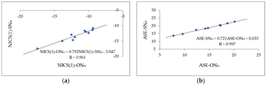 Linear relations between magnetic NICS(1) indices (a) and between energetic ASE indices (b) estimated for N derivatives of furan and thiophene. NICS(1) and ASE are taken from Ref. [75]. NICS(1)-ONn and ASE-ONn correspond to furan and its N-derivatives and NICS(1)-SNn and ASE-SNn refer to thiophene and its N derivatives.