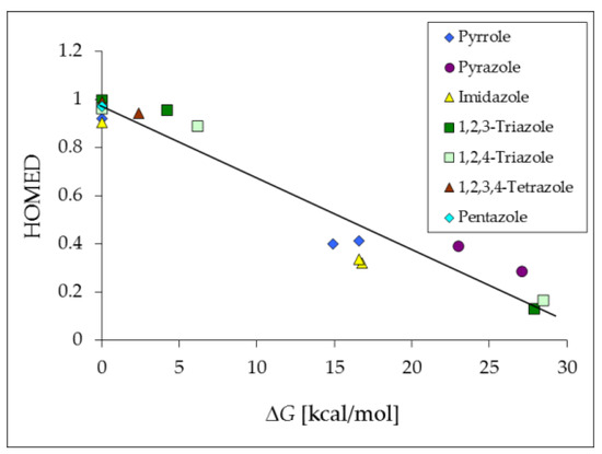 Plot between the relative Gibbs energies (ΔG) and HOMED indices for possible tautomers of azoles. Data taken from Table 4.