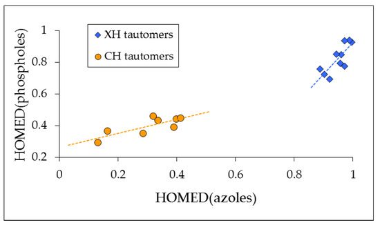 The linear tendencies can be observed between the relative Gibbs energies and HOMED values estimated for the NH and CH forms of azoles (Figure 6). These simple relations indicate that aromaticity affects the isomeric preferences for N-containing heterocycles. For phospholes and phosphazoles, the relations between two phenomena, prototropic tautomerism (described by relative Gibbs energies) and delocalizations of n- and π-electrons (determined by HOMED) are not so simple for azoles. Aromaticity cannot be considered as the principal factor that determines the structure of the favored tautomer in phospholes.