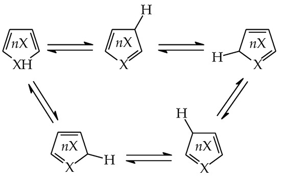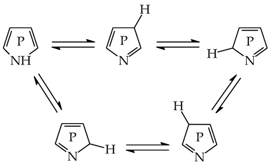 It is well recognized that pyrrole and its N derivatives exhibit prototropic tautomerism [9,21,22,57,76,77,78,79,80,81,82,83,84,85,86,87,88]. The labile proton can move from one site to the other according to 1,3- or 1,5-shift. Since proton transfer takes place between conjugated sites, it is always accompanied by a rearrangement of π-electrons. Hence, prototropic tautomers are never zwitterions. For azoles, five tautomers are possible with the labile proton at N (NH tautomers) or C atom (CH tautomers). Analogous proton transfer (Scheme 1) and analogous five tautomers (PH and CH) can be considered for phosphole and its P derivatives [89]. Depending on the position of additional N atoms in azoles and P atom in phospholes, some tautomers have the same structures. For example, tautomers with the labile proton at C2 and C3 possess the same structures as those with the labile proton at C5 and C4, respectively, for pyrrole and phosphole.
