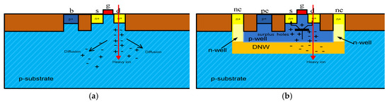 After a heavy ion strike at the center of the drain of the bulk NMOSFET in a normal strike, numerous generated electron-hole pairs were generated along the ion trajectory, as shown in Figure 3a. The drain collected the generated electrons, making a SET appear at the output of the inverter. Electron–hole pairs generated by the strike were dispersed in the substrate at the same probability, so the bulk potential was not increased significantly. The parasitic bipolar transistor (BJT) consisting of source–bulk–drain is not activated and the bipolar effect is insignificant in the bulk NMOSFET.