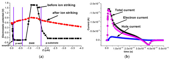 After a heavy ion strike at the center of the drain of the bulk NMOSFET in a normal strike, as shown in Figure 3b, the generated holes were prevented from entering the substrate by PN junctions, which were located between the p-well and the DNW. The excess holes led to an increased p-well potential (as shown in Figure 4a). The parasitic BJT is activated: A large number of electrons were injected into the p-well and drifted to the drain eventually (as shown in Figure 4b). The electrons collected by the drain will increase, causing an increase in WSET.