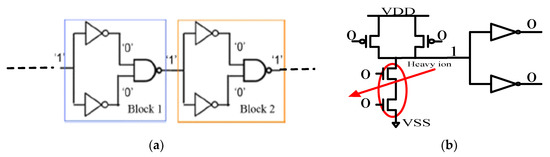 As shown in Figure 5, the N-hit cell and chain, proposed by Gadlage for NMOSFET SET production and propagation [6], are introduced in our work. In this chain, an off-state PMOSFET in inverter cell or an off-state NMOSFET in the NAND cell can produce “010” SET or “101” SET. However, the “010” SET produced in a PMOSFET cannot propagate through the chain due to the logic shield of the NAND cell. Therefore, only the “101” SET produced in a NMOSFET can travel through the chain and be captured by the terminal SET monitoring circuit, which was proposed by Narasimham [17]. In our circuit, four short 200-stage N-hit chains are in turn connected to an OR logic cell, which is connected to the SET monitoring circuit.