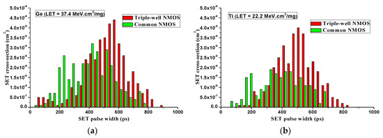 The cross-sections of captured single-event transients in the bulk NMOSFET and triple-well NMOSFET are shown in Figure 6 and Figure 7 at Ge (LET = 37.4 MeV·cm2/mg) and Ti (LET = 22.2 MeV·cm2/mg) exposures. Compared with the bulk NMOSFET, Figure 6a indicates that the total single-event transients cross-section at Ge (LET = 37.4 MeV·cm2/mg) exposure increased significantly in the triple-well NMOSFET. At the larger areas, the number of monitored SETs is found to significantly decrease in the bulk NMOSFET. The comparison of SET areas in these two types of NMOSFETs under Ti irradiation is shown in Figure 6b. The distribution in Figure 6a,b is similar. Not only is the number of monitored SETs found to significantly decrease in the bulk NMOSFET, but also WSET is significantly decrease.