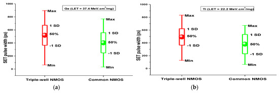 The SET pulse widths (WSET) produced in the bulk NMOSFET and triple-well NMOSFET are shown in Figure 2. The pulse width is defined as the width between 50% of the rising and falling edges of the pulse amplitude. As shown in Figure 2, the WSET in the bulk NMOSFETs was smaller than that in triple-well NMOSFETs. The difference is also shown in Figure 2. When the linear energy transfer (LET) is 10 MeV∙cm2/mg, the difference is 32 ps. When the linear energy transfer (LET) is 50 MeV∙cm2/mg, the difference is more significant, reaching 82 ps.