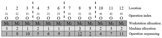 In order to understand the encoding system, consider an example containing 4 jobs and 3 workstations. A flexible manufacturing system with parallel machines is designed in such a way that each job has 3 operations and each workstation has 3, 2, 2 uniform parallel machines, respectively. Also, the manufacturing system is completely flexible. The chromosome corresponding to the solution contains 3 rows of length 12 and is encoded as in
