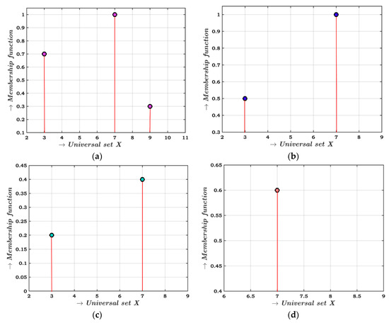 The membership function of the multi-fuzzy set is represented by four different combinations of membership functions of 3, 7 and 9, where (a) the graphical representation of , (b) the graphical representation of , (c) the graphical representation of and (d) the graphical representation of are presented respectively.