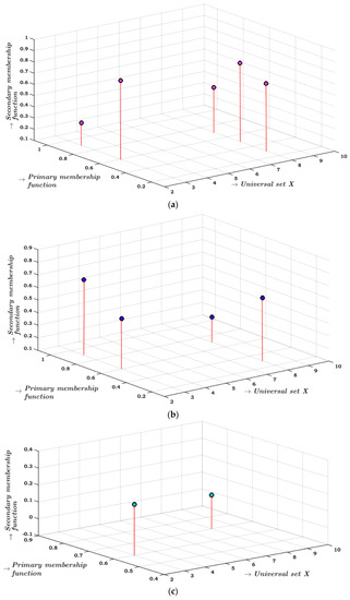The membership function of T2MFS is represented by three different combinations of primary membership and secondary membership functions of 3 and 8, where (a) the graphical representation of , (b) the graphical representation of and (c) the graphical representation of are presented respectively.