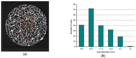 Micro-structure and cell size distribution of a foam concrete sample: (a) Micro-structure; (b) statistics of cell size distribution.