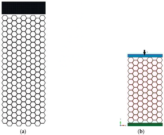 As the computational time to simulate the dynamic crushing response of the honeycomb with the model in Figure 2a is too long, a smaller but similar honeycomb model with 7 horizontal cells and 12 vertical cells is established while each cell is the same as that in Figure 2a, shown in Figure 2b. Similarly, two steel plates of 5.5 mm and 0.5 mm in-plane and 0.015 mm out-of-plane sandwich the honeycomb. Different from the model in Figure 2a simulating the dynamic response, in Figure 2b, while the lower plate remains stationary, the upper plate crushes the honeycomb with an initial velocity, rather than a constant speed. With some rounds of trial computations, the initial speed of the upper plate for energy absorption study is set as 2 to 7 m/s.