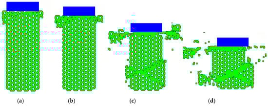 Response of concrete honeycomb subjected to 1 m/s constant speed crushing: (a) t = 0.876 ms; (b) t = 1.753 ms; (c) t = 5.259 ms; (d) t = 8.765 ms.
