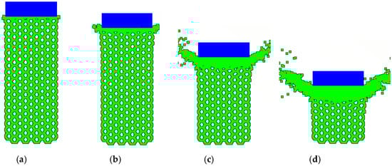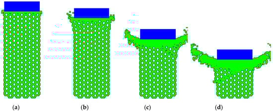 Response of concrete honeycomb subjected to 18 m/s constant speed crushing: (a) t = 0.0487 ms; (b) t = 0.0974 ms; (c) t = 0.292 ms; (d) t = 0.457 ms.