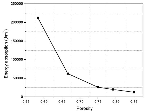 If the plate impacting velocity is fixed at 7 m/s, the energy absorption capacity of different porosity (e.g., 0.846, 0.792, 0.75, 0.667, 0.593) is examined and shown in Figure 7. As expected, the higher the porosity, the lower the specific energy absorption.