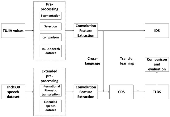 There are two main contributions from this paper. First, speech features are extracted using a convolutional neural network. In addition, cross-language hidden layer weights are shared using a bi-directional long short-term memory network. Using Chinese speech datasets as extended datasets can solve the insufficiency of the Tujia language. The second point is to use the method of transfer learning. The initial model is built by training the Tujia language and Chinese corpus by means of modifying the softmax layer of the initial model and proceeding with sample transfer learning. Then, continuing to train with the Tujia corpus obtains the final model.