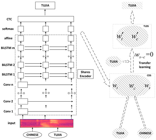 The cross-language end-to-end speech recognition model structure based on transfer learning is shown in Figure 4. In the training phase of CDS, the input of the model is the spectrum of the Tujia language and Chinese phonetics. After the multi-layer convolutional layer is extracted, it enters the multi-layer BiLSTM, which completes the cross-language acoustic feature extraction and the shared hidden layer weight learning. At this time, in the softmax layer of the model, the weights of the IPA of the Tujia language, the Chinese IPA, and the IPA dictionary of the two languages are , respectively, and finally the CTC model is used instead of the traditional HMM to calculate the transition probability between states. The recognition result is decoded by the Tujia language code dictionary, and the output of the model is the Tujia language IPA. However, sample transfer is performed on the model CDS. First, the weight corresponding to the difference set of the dictionary with respect to the dictionary is set to 0. At this point, the output of the model is only the Tujia language IPA sequence, and then the model is continued using the Tujia language data. A few iterative trainings are performed to improve the generalization and stability of the model to the Tujia language data, and finally the model TLDS is obtained.