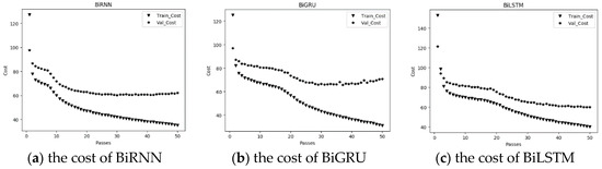 The change in the cost of BiRNN, BiGRU, and BiLSTM’s as the number of training passes increases.