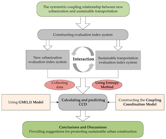 At present, the uncoordinated development of urbanization and transportation systems in China is very prominent, especially in large cities. It is necessary to explore the mechanism of symmetrical and coordinated development between new urbanization and sustainable transportation theoretically. This study aimed to explore the symmetrical coupling degree of NU and ST in big cities, and uses China’s nine metropolises (Beijing, Tianjin, Shanghai, Guangzhou, Chongqing, Chengdu, Wuhan, Zhengzhou and Xi’an) as research objects. Firstly, after referring extensively to the existing literature on evaluation indicators of urbanization and transportation system, this study constructed an evaluation index system for NU and ST. Thereafter, for measurement and analysis purposes, a coupling coordination degree (CCD) model was established to calculate the degree of symmetrical coupling between NU and ST, and the calculation results were analyzed with ArcGIS in different years. Next, combined with China’s future urbanization development plan [], a grey time series prediction method, namely the GM(1, 1) model, was used to predict the CCD values of the nine metropolises during the period 2019–2025. Finally, based on the results, we put forward optimization strategies for the future development of NU and ST in China, and provide suggestions for promoting comprehensive and sustainable urban development. The research framework of this study is shown in Figure 1.
