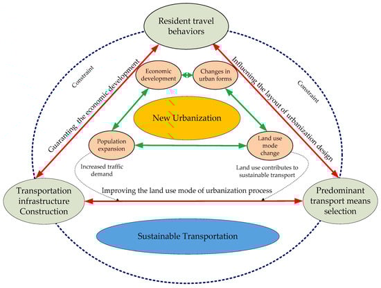 The existing literature shows that there are many measures and index systems for assessing the level of development of traditional urbanization [,] and transportation [,]. Based on the relationship between urbanization and urban transportation (see Figure 2), this study synthesized the existing literature and identified the most cited and most convenient indicators for urban development and urban transportation. Then we established a scientific and objective evaluation index system in accordance with the research purpose.