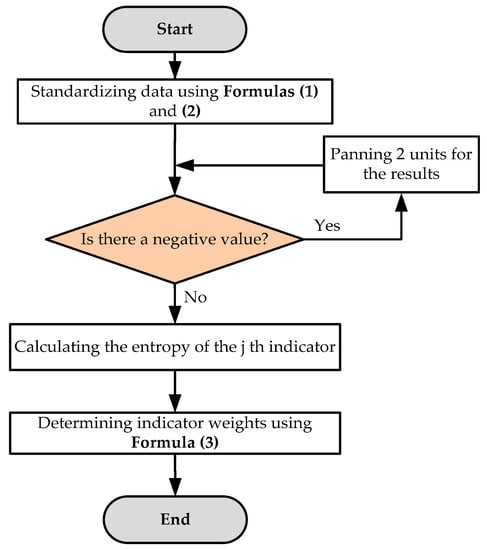 It was necessary to take the natural logarithm of the normalized data and the antilogarithm must be greater than 0; as such, the entropy method was no longer suitable. This study panned the standardized data by 2 units. Then, the entropy method was used to calculate the weight of each index in the two systems: new urbanization and sustainable transportation. The specific process for calculating the weight is shown in Figure 3. The calculation process was as follows: