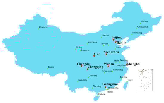 In this study, nine national metropolises in China were the research areas. They included Beijing, Tianjin, Shanghai, Guangzhou, Chongqing, Chengdu, Zhengzhou, Wuhan, and Xi’an (see Figure 4). The study period was 2007–2016. The data in the new urbanization index system were mainly collected from the 2008–2017 Statistical Yearbooks for each metropolis. The data related to the sustainable transportation index system were mainly collected from the urban traffic yearbooks for the different cities.