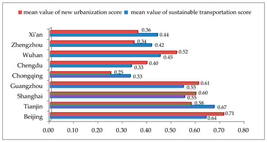 With respect to the comprehensive sustainable transportation score, Figure 5 shows that the average scores of new urbanization in Beijing, Shanghai, Guangzhou, Chengdu, and Wuhan were greater than the average sustainable transportation scores. That is, sustainable transportation development lagged behind new urbanization. In contrast, for Tianjin, Chongqing, Zhengzhou and Xi’an the development of new urbanization lagged behind sustainable transportation.