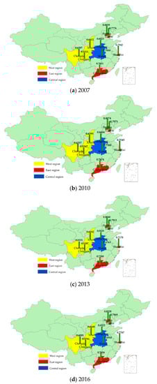The CCD for Zhengzhou was in a consistent state of decline before 2010. However, after 2010, it began to significantly recover and CCD values changed from 0.56 to 0.64, reflecting a change in the two systems from the reluctant coordination stage to the primary coordination stage. In Xi’an, the CCD values first declined and then rebounded, but remained in the primary coordination stage. Based on the location of the metropolises, the sustainable transportation comprehensive score in the eastern cities increased over time, at a growth rate of 6.33% which was consistently higher than the central and western cities. The central cities experienced a downward fluctuating trend, but were consistently higher than the western cities. The CCD values of the western cities experienced slow growth, at a rate of 0.30%. The consistently higher CCD values of the eastern cities highlight the significant differences in new urbanization and sustainable transportation development between the eastern, western, and central cities.