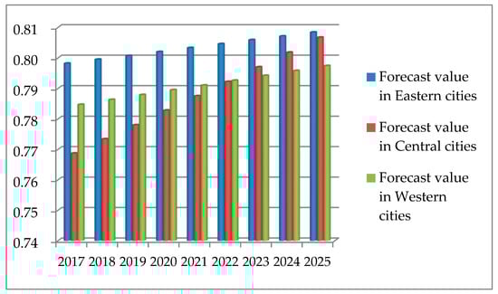 Figure 8 shows a general annual decrease in the coordination gap between the eastern Cities, the central Cities and the western Cities with respect to NU and ST. In 2025, the coupling coordination degree of each region is predicted to reach 0.79, 0.80; when the two systems will be in the intermediate coordination stage, and regional balanced development will be achieved. This is mainly driven by Beijing, Tianjin, Shanghai, Guangzhou, and the other areas considered to be national first-tier cities, which have the opportunities needed to attract a large number of talented people from across the country.