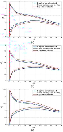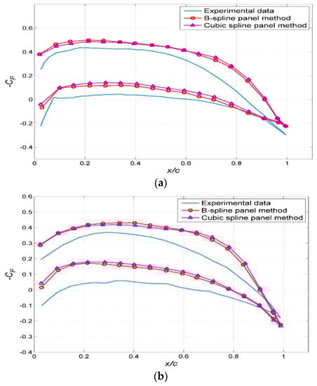 Figure 10a–d show that the calculated results are in good agreement with the experimental data [33], and the average error using the B-spline panel method is within 6.3% whereas the average error was 7.1% using the cubic spline panel method. The results for NACA0012 and NACA2410 have the highest degree of agreement. There are some differences between the calculated results and experimental data for NACA6412 and NACA4418, but the trend of the pressure coefficient curve obtained through calculation is in good agreement with the experimental data [33]. The higher the degree of the camber line, the greater the effect on the calculation accuracy; the number of panels also has some influence on the calculation results. For the two-dimensional hydrofoil, the number of panels should be controlled in the range of 40–80. A lower grid density would lead to less accuracy. Figure 11 shows a comparison of the calculated and experimental results of lift coefficient for NACA0012 at different angles of attack using the B-spline and cubic spline panel methods. The calculated results using the B-spline panel method show a higher degree of agreement with the experimental data.