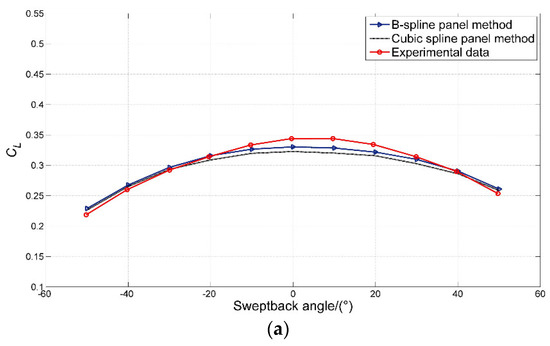 Compared with the straight rectangular hydrofoil, the sweptback hydrofoil can effectively reduce the impact force of the flow and improve the hydrodynamic performance. To test the adaptability and stability of the panel method, rectangular hydrofoils with different sweptback and sweptforward angles were selected for analysis. The hydrodynamic performance was calculated with different sweepback angles at a limited angle of attack using the panel method. Discretization of the hydrofoil was performed using the cosine-clustering method. The aspect ratio was set to 6 and the angle of attack was set to 5°. A comparison of the calculation results and the experimental data of the sweptback hydrofoil performance [41] is given in Figure 14. The experimental data considered the ground effect on the sweptback hydrofoils whereas the prediction of the sweptback hydrofoil performance in the present panel method did not consider the ground effect, hence, the value of the experimental lift coefficient at the zero sweptback angle is greater than those of the panel methods as shown in Figure 14a.