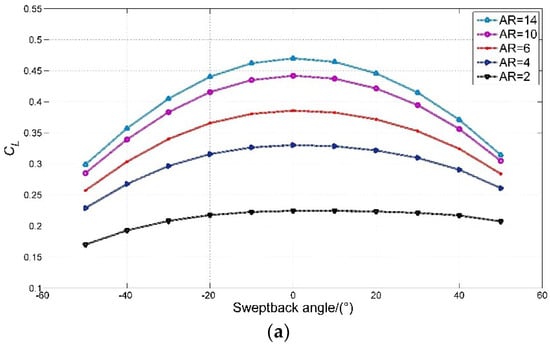 Figure 15a–d show that the lift coefficient and the lift-to-drag ratio increase with the increased aspect ratio of the sweptback hydrofoil, while the induced drag coefficient and moment coefficient decrease.